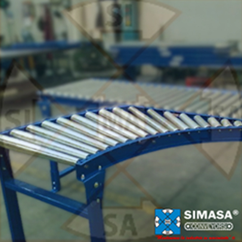 El transportador curvo o curva de rodillos está diseñado específicamente para cambiar la dirección de los productos dentro de un sistema