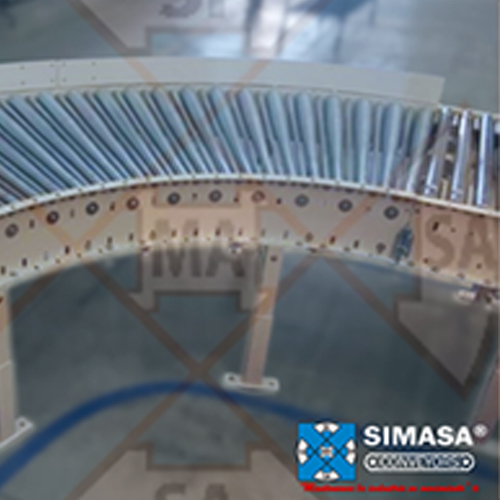 Cuenta con rodillos montados de forma radial sobre una estructura curva, lo que asegura que los productos mantengan una trayectoria estable durante el giro.